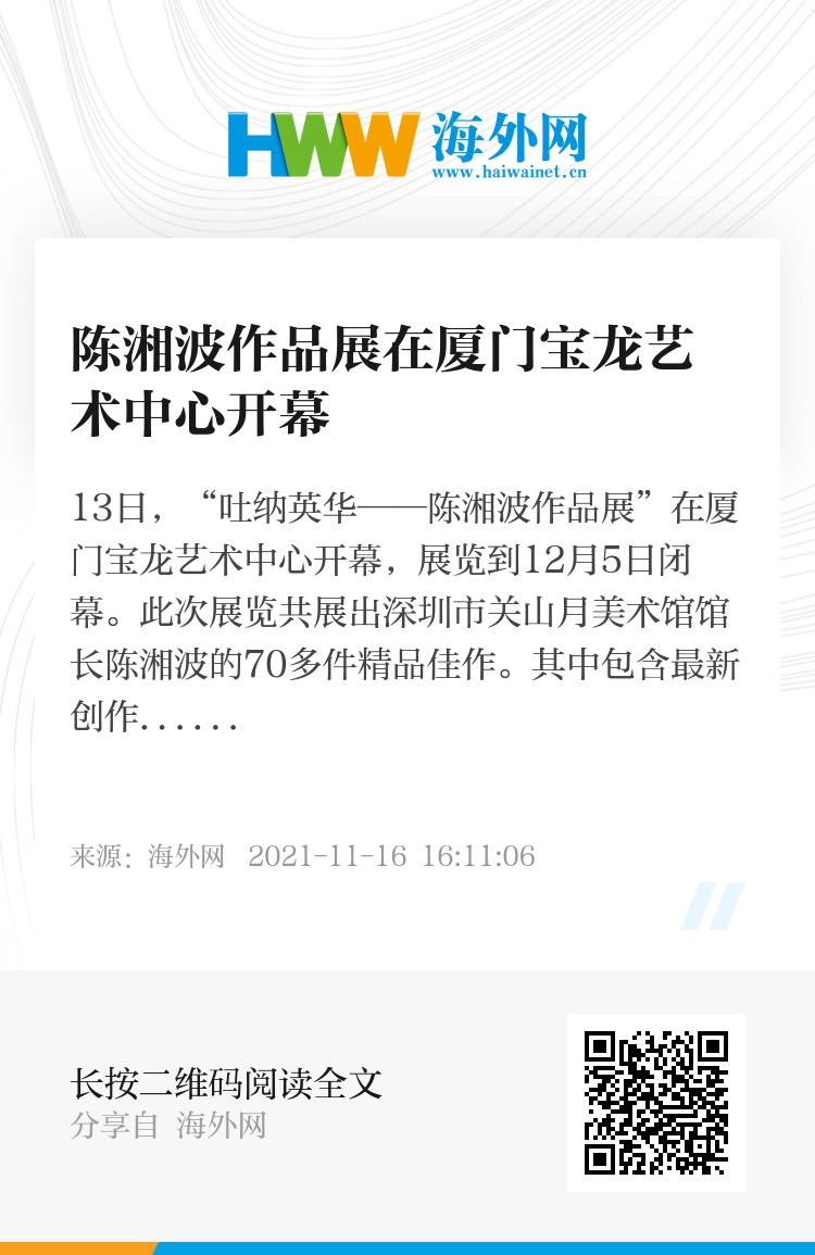 陈湘波至今有百余幅作品被包括中国美术馆在内的重要机构收藏,在美国、匈牙利等国家及中国香港、内地举办个人画展10余次,作品多次参加国家、省市级美术展并获奖。此次展览可以说是他从艺近50年来的作品的完整体现,将持续至12月5日。