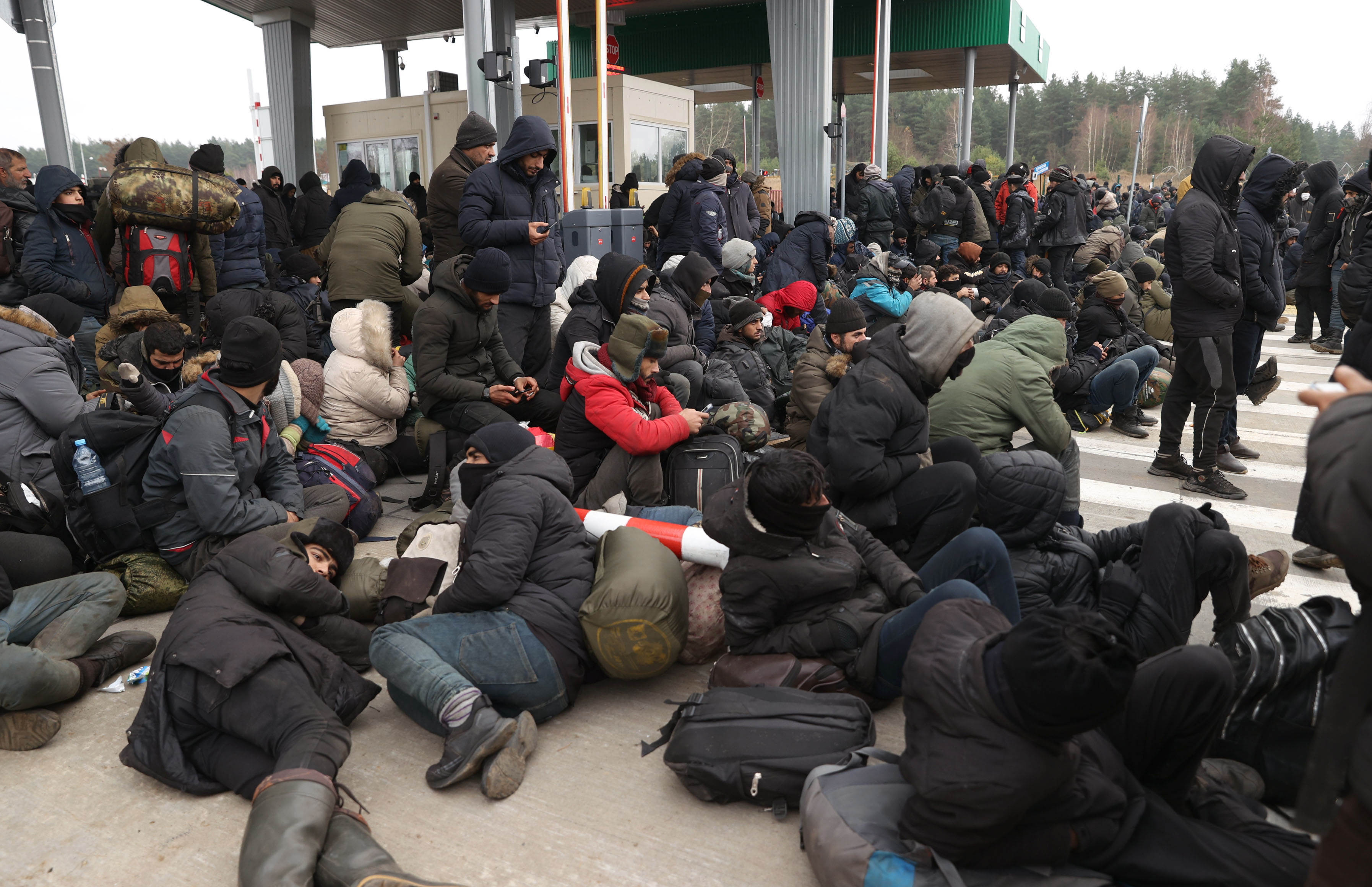当地时间11月15日,白俄罗斯边境,难民和移民聚集白俄罗斯边境口岸。图片来源:澎湃影像