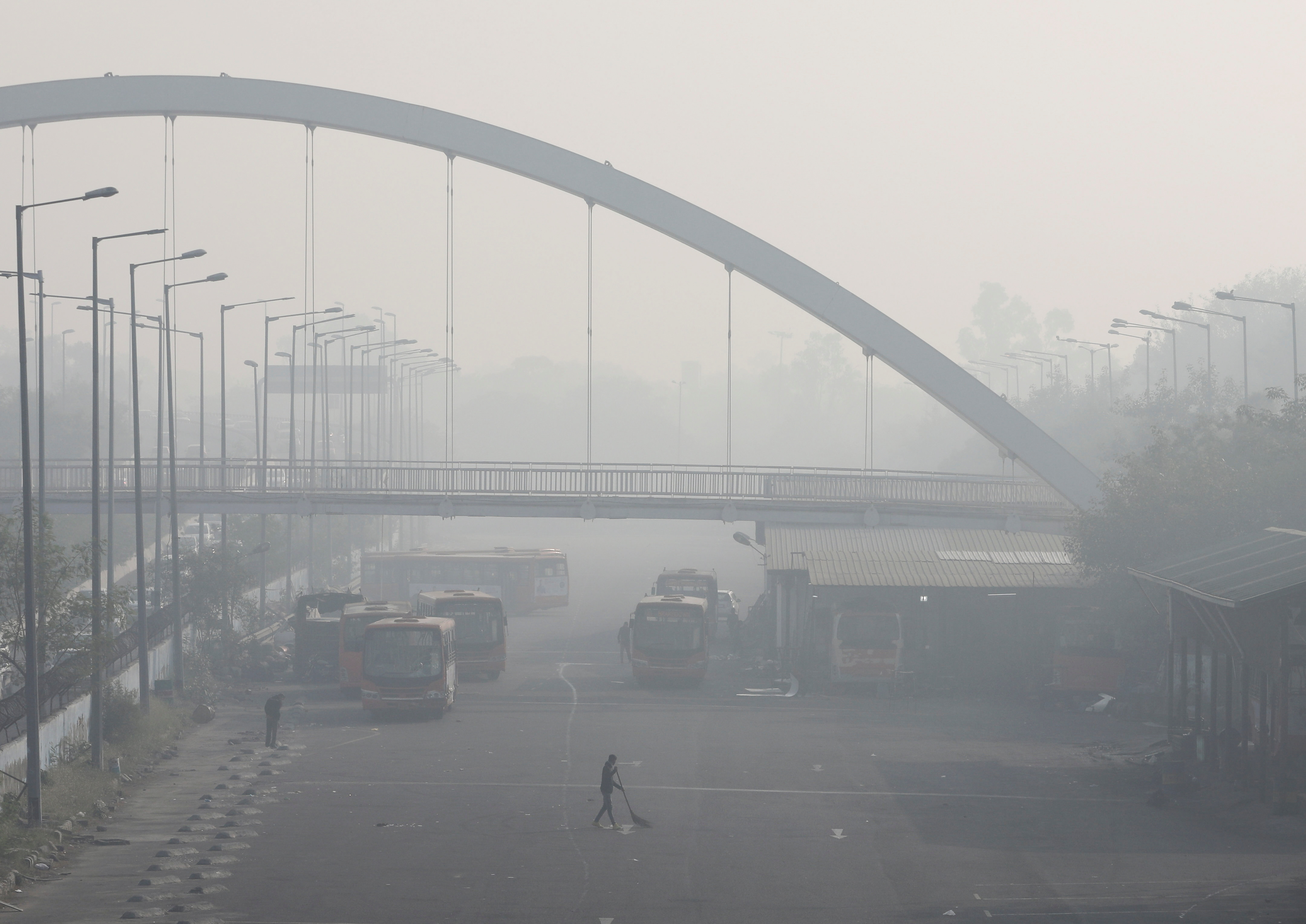 当地时间2021年11月16日,印度新德里,当地的建筑物和景观都被烟雾笼罩。近期,印度新德里空气进一步恶化,可见度不断降低。(图:东方IC)