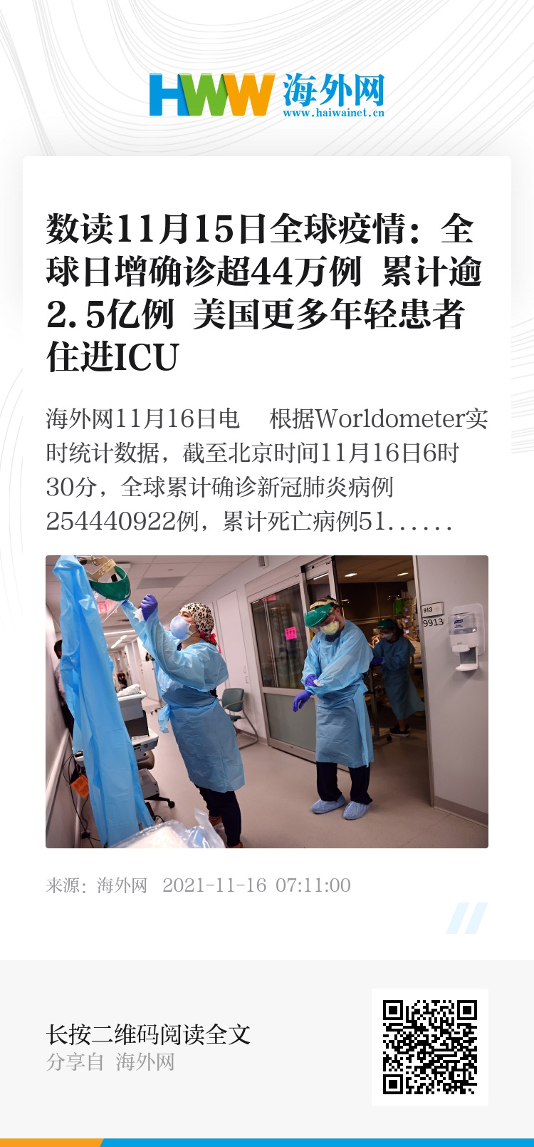 海外网11月16日电 根据Worldometer实时统计数据,截至北京时间11月16日6时30分,全球累计确诊新冠肺炎病例254440922例,累计死亡病例5120072例。全球单日新增确诊病例444758例,新增死亡病例5347例。