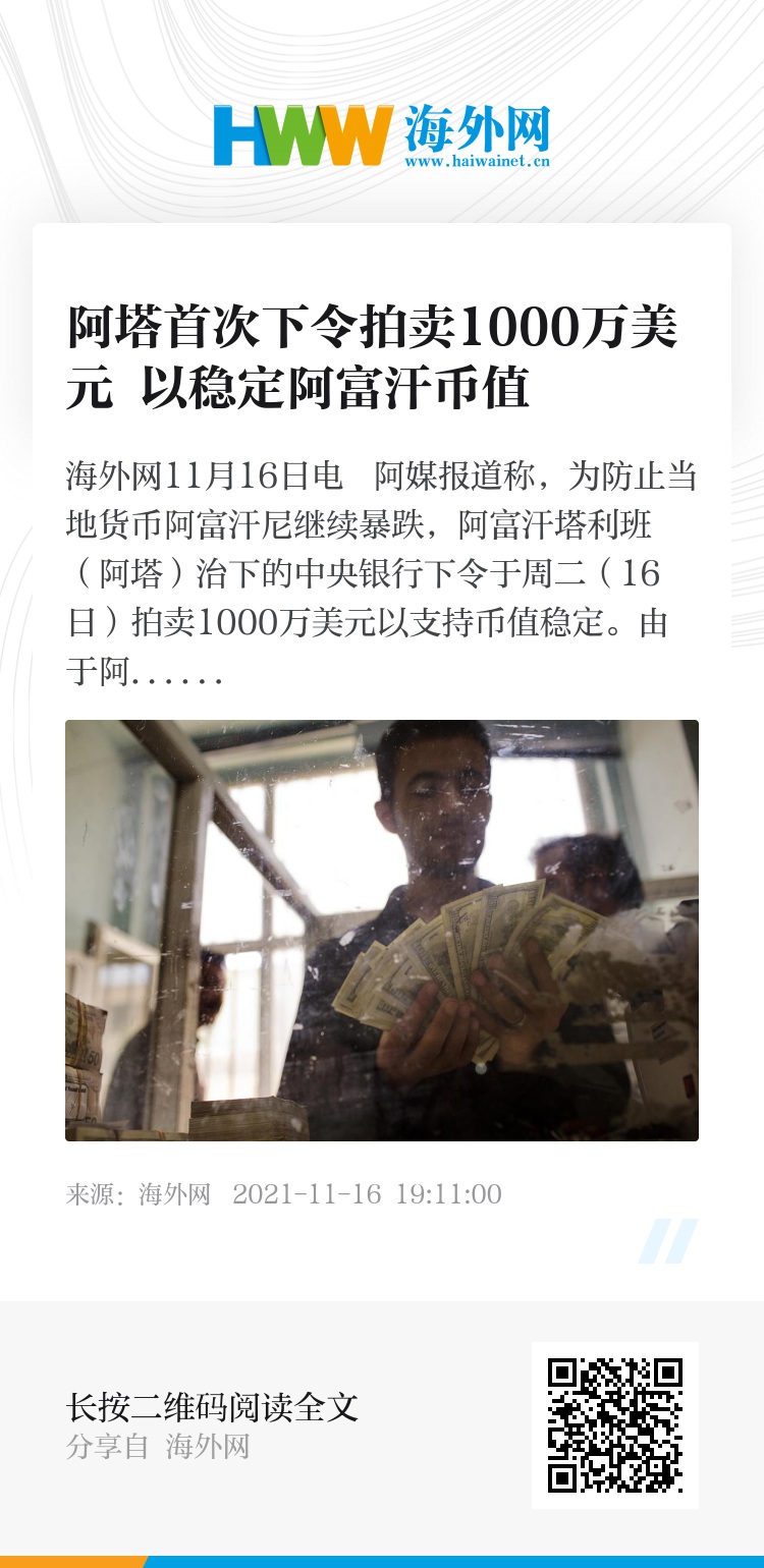 据阿富汗哈马通讯社(khaama)16日消息,这是阿塔临时政府治下的首次此类拍卖行为。阿富汗中央银行在一份声明中表示,符合条件的银行和货币兑换商可以参与竞标,所有成功的投标必须在当天结束前全部结算完毕。该声明还表示,阿富汗银行系统的运作将很快恢复正常,阿富汗尼的稳定将得到维持。