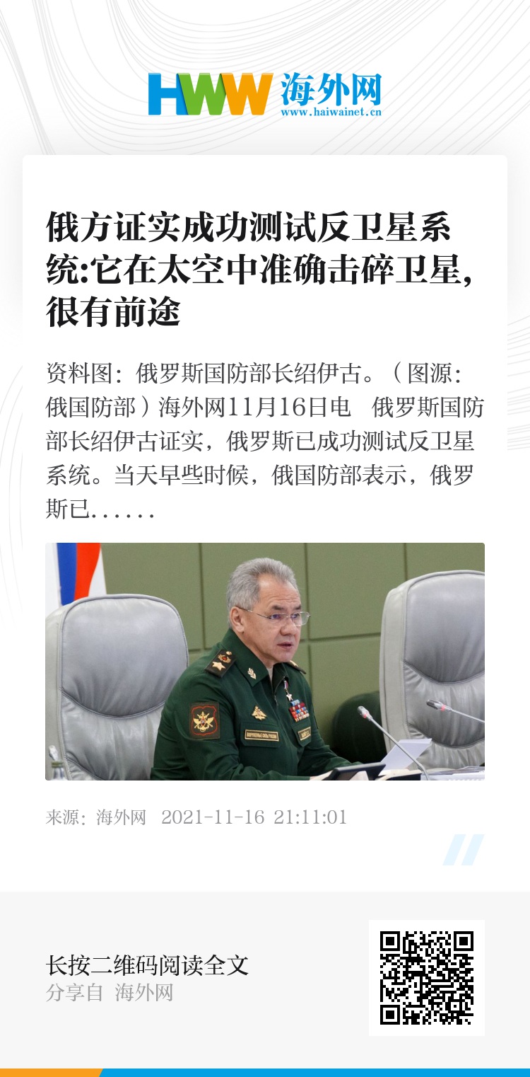 据俄罗斯卫星通讯社16日报道,绍伊古在前往部队视察期间表示,“我们真的成功地测试了一个有前途的系统,它准确地击中了一颗旧卫星。”绍伊古还补充说,在反卫星系统测试期间形成的旧卫星碎片不会对太空活动构成任何威胁。