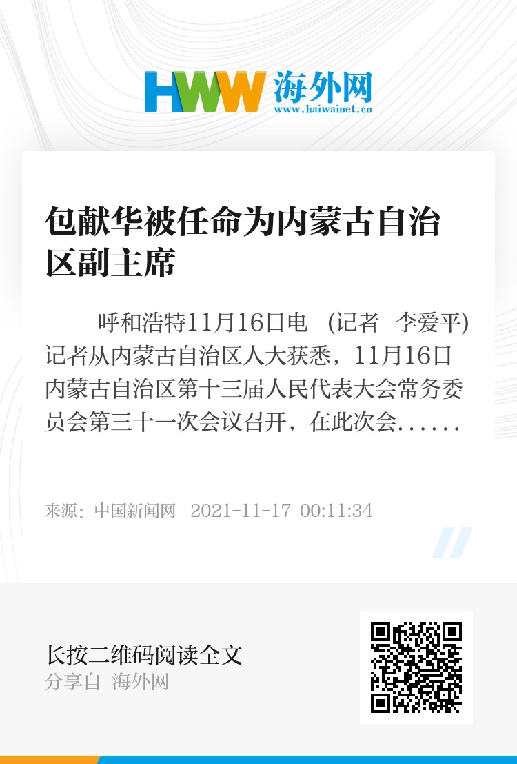 中新网呼和浩特11月16日电 (记者 李爱平)记者从内蒙古自治区人大获悉,11月16日内蒙古自治区第十三届人民代表大会常务委员会第三十一次会议召开,在此次会议上,包献华被任命为内蒙古自治区副主席。