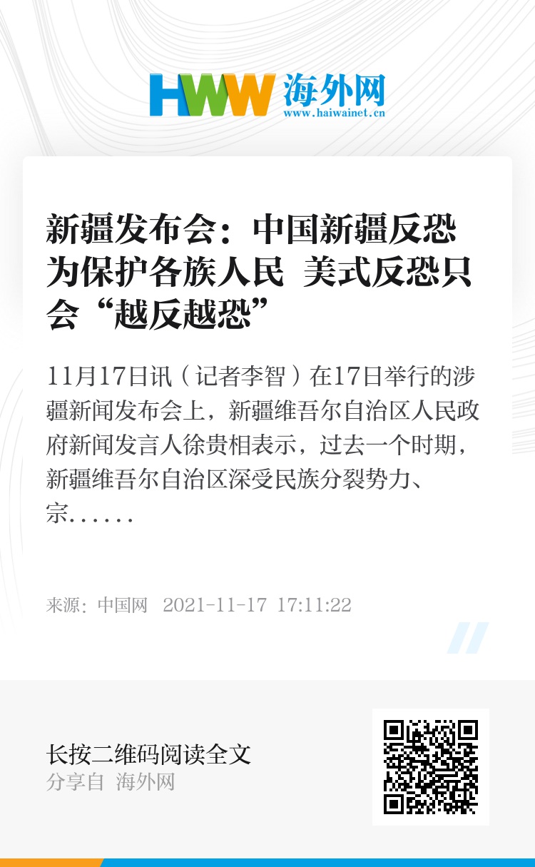 新疆维吾尔自治区人民政府新闻发言人伊力江•阿那依提分析,美国打了长达20年的“反恐”战争,但却以失败告终,根源在于“美式反恐”是一种政治工具,实质上不是为了保护人民,而是为了维护美国利益、输出意识形态。