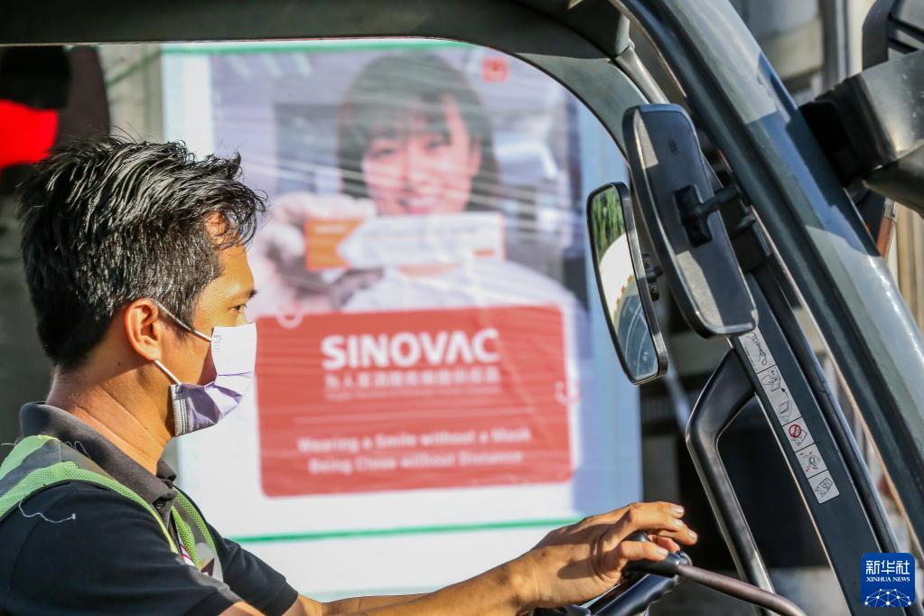 11月17日,工作人员在菲律宾马尼拉机场卸载中国科兴新冠疫苗。菲律宾政府采购的中国科兴新冠疫苗17日运抵菲首都马尼拉。新华社发(乌马利摄)