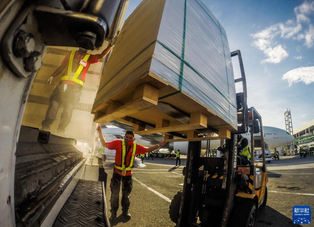 11月17日,工作人员在菲律宾马尼拉机场卸载中国科兴新冠疫苗。菲律宾政府采购的中国科兴新冠疫苗17日运抵菲首都马尼拉。新华社发(乌马利摄)