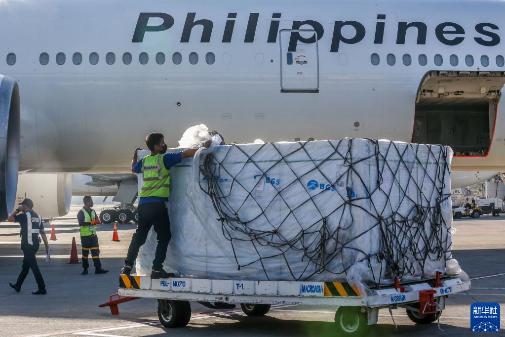 11月17日,工作人员在菲律宾马尼拉机场卸载中国科兴新冠疫苗。菲律宾政府采购的中国科兴新冠疫苗17日运抵菲首都马尼拉。新华社发(乌马利摄)