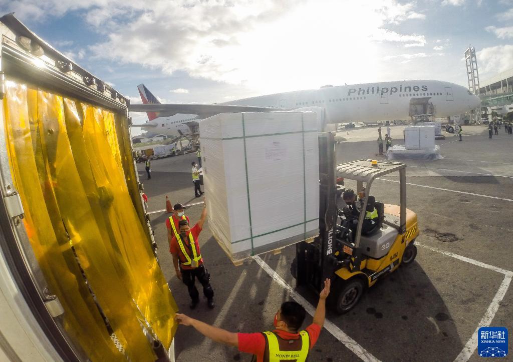 11月17日,工作人员在菲律宾马尼拉机场卸载中国科兴新冠疫苗。菲律宾政府采购的中国科兴新冠疫苗17日运抵菲首都马尼拉。新华社发(乌马利摄)