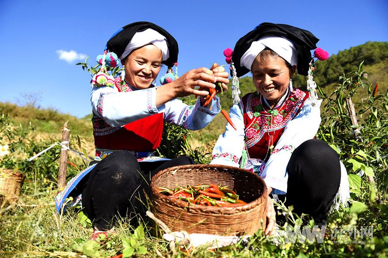 2021年11月2日,云南省大理州巍山县五印乡新民村委会闭利色村彝族群众正在山地里采摘朝天椒。深秋时节,云南省大理白族自治州巍山彝族回族自治县6000多亩朝天椒喜获丰收,当地农民抢抓市场机遇,纷纷下田采摘和销售朝天椒,乡村一派丰收繁忙的喜人景象。今年,该县朝天椒总产量预计达6000多吨,总产值3600万元,亩均收入6000多元,产品畅销北京、上海、广州、深圳、重庆等地市场。(供图:东方IC)