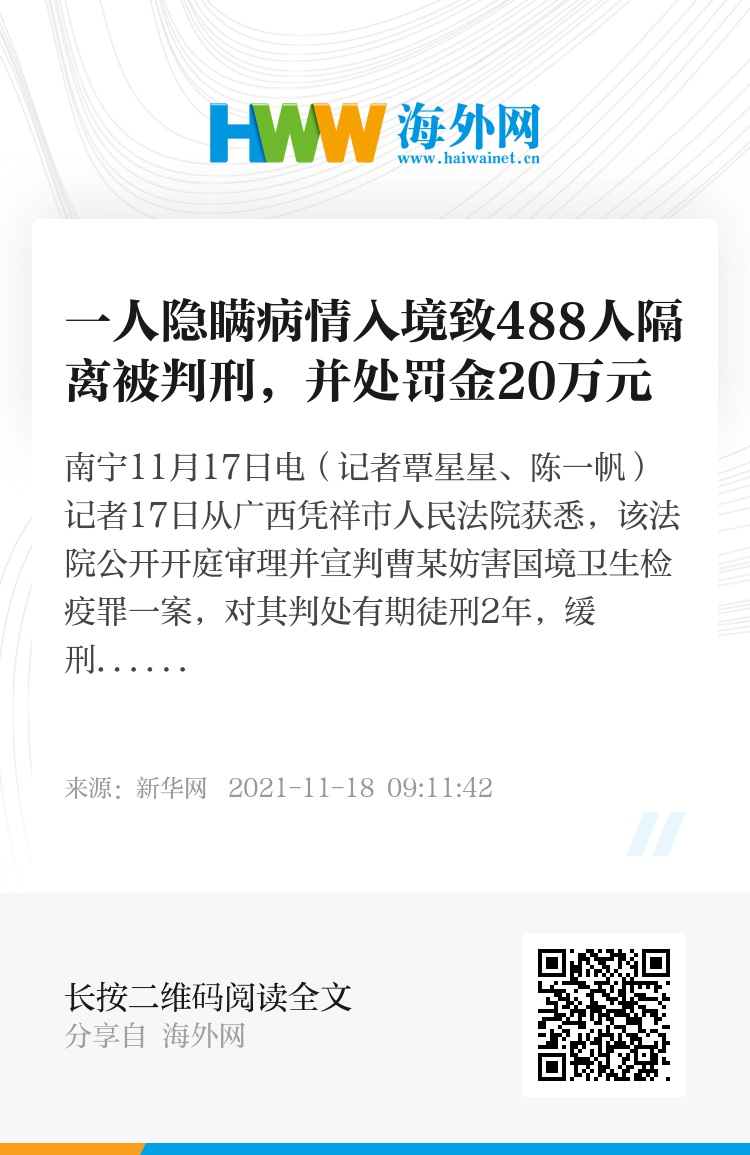 新华社南宁11月17日电(记者覃星星、陈一帆)记者17日从广西凭祥市人民法院获悉,该法院公开开庭审理并宣判曹某妨害国境卫生检疫罪一案,对其判处有期徒刑2年,缓刑3年,并处罚金人民币20万元。