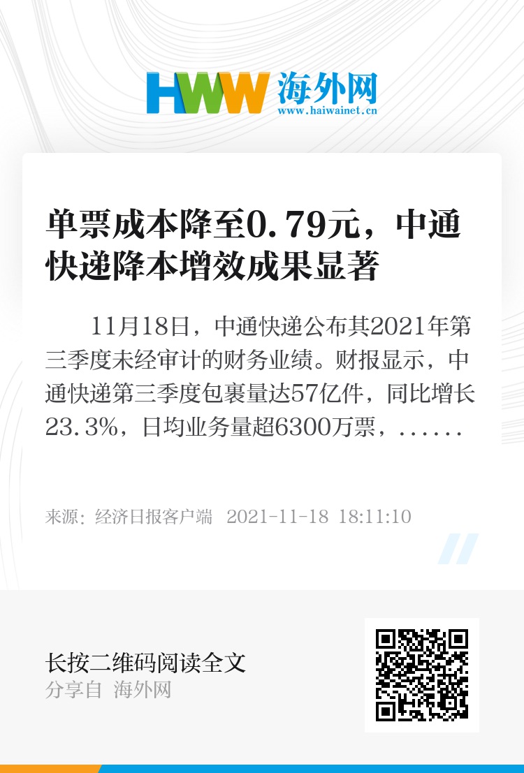 11月18日,中通快递公布其2021年第三季度未经审计的财务业绩。财报显示,中通快递第三季度包裹量达57亿件,同比增长23.3%,日均业务量超6300万票,市场占有率保持20.8%。