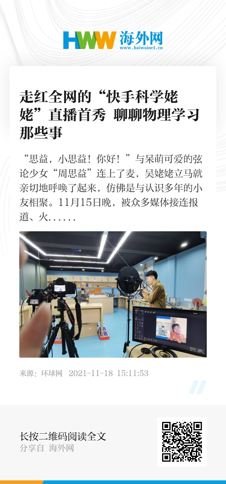 11月15日晚,被众多媒体接连报道、火遍全网的“快手科学姥姥”完成了她的直播首秀!这场直播活动由快手联合上海新闻晨报举办,两位女性物理学者和大伙儿一块聊了聊物理学习的那些事儿。
