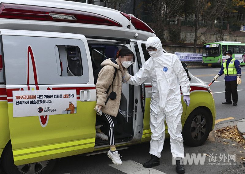 当地时间2021年11月18日,韩国,大学修学能力考试即高考开始,各地考生接受防疫检查后进入考场。(图:澎湃影像)