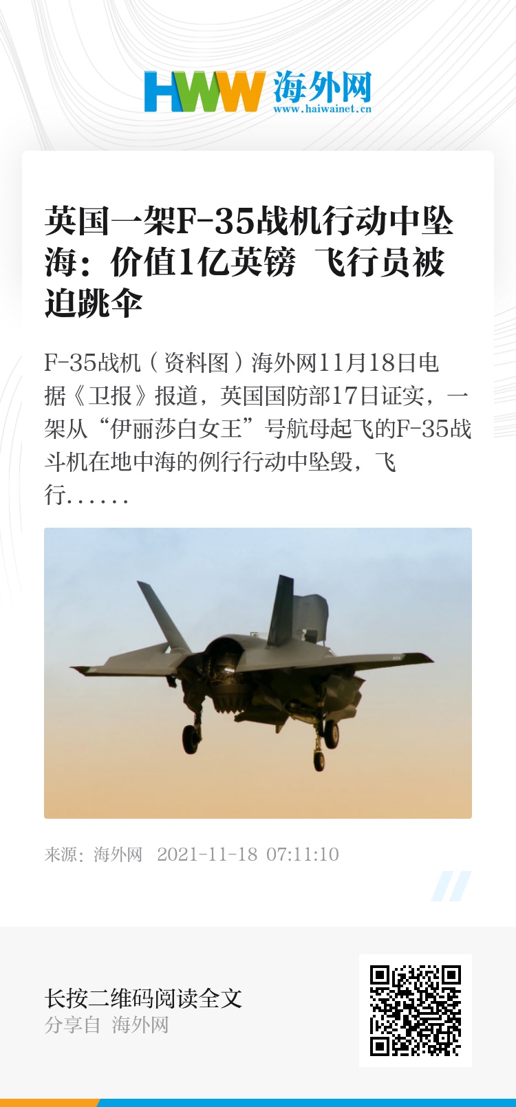 海外网11月18日电 据《卫报》报道,英国国防部17日证实,一架从“伊丽莎白女王”号航母起飞的F-35战斗机在地中海的例行行动中坠毁,飞行员被迫跳伞逃生,已经获救。
