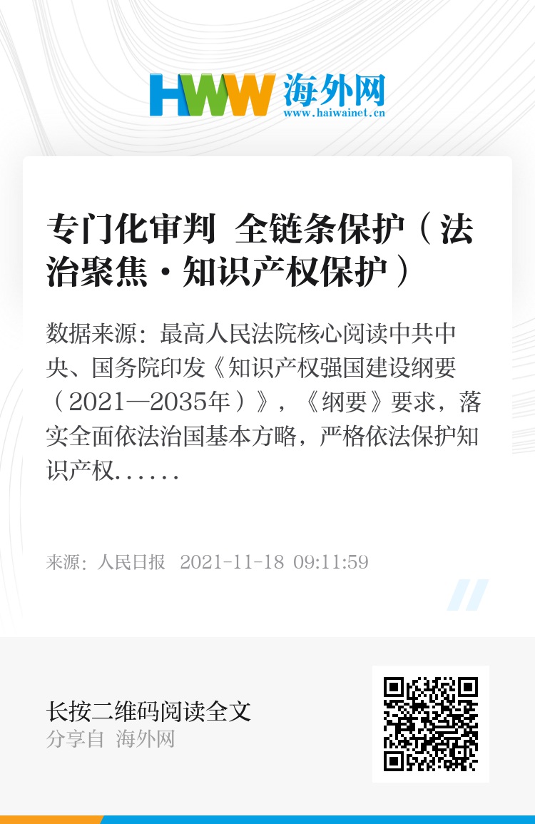 中共中央、国务院印发《知识产权强国建设纲要(2021—2035年)》,《纲要》要求,落实全面依法治国基本方略,严格依法保护知识产权,切实维护社会公平正义和权利人合法权益。近年来,人民法院积极推动知识产权专门化审判,破解维权难题,进一步强化知识产权全链条保护。