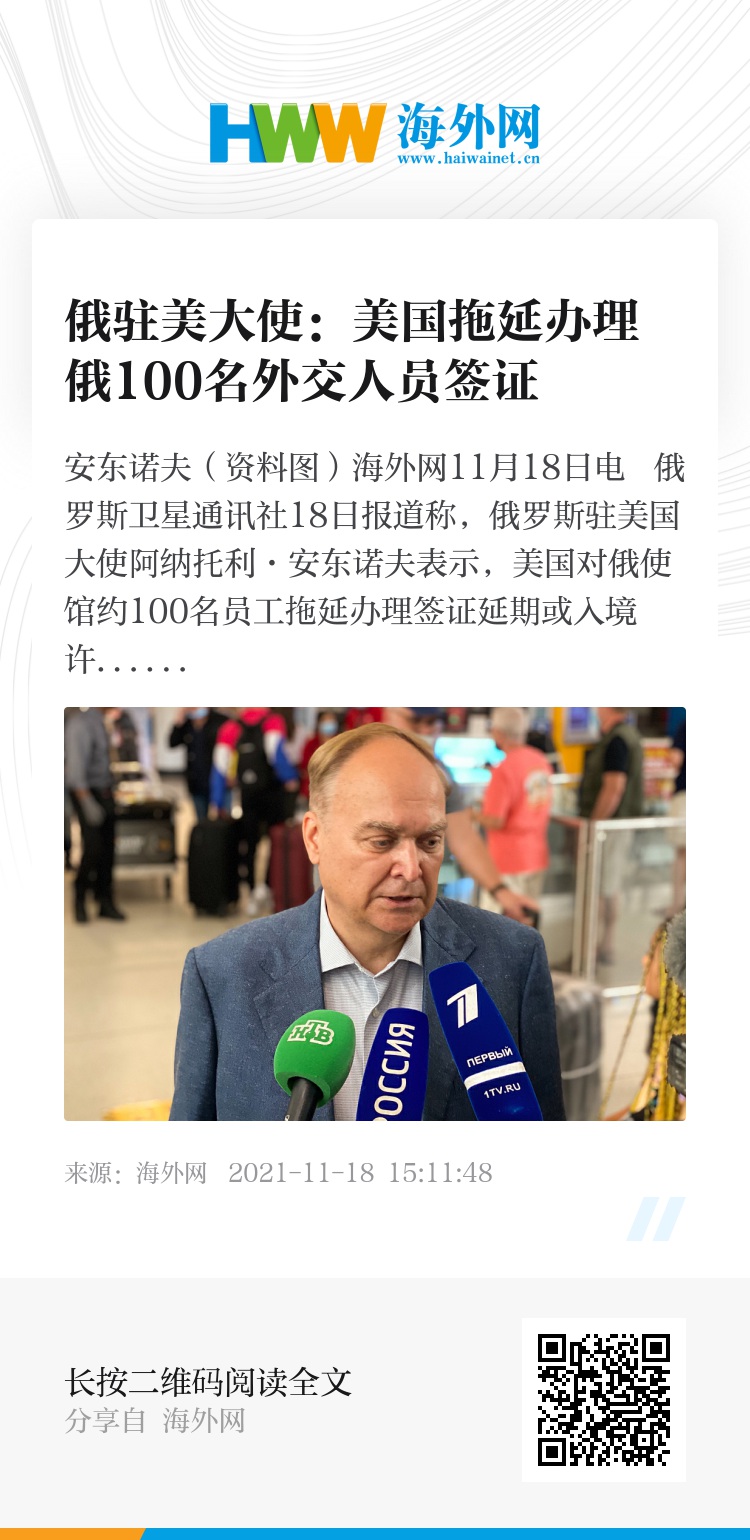 海外网11月18日电 俄罗斯卫星通讯社18日报道称,俄罗斯驻美国大使阿纳托利·安东诺夫表示,美国对俄使馆约100名员工拖延办理签证延期或入境许可。