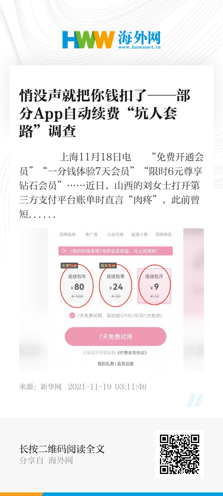 和刘女士一样,不少网民发现,手机扫一扫就能轻松开通各种会员包月、包年服务套餐,但稍不注意就可能掉进商家设好的“坑”。“新华视点”记者调查发现,部分App“自动续费”套路深,引导消费者入“坑”,并给退订续费服务设置诸多障碍,侵犯消费者合法权益。