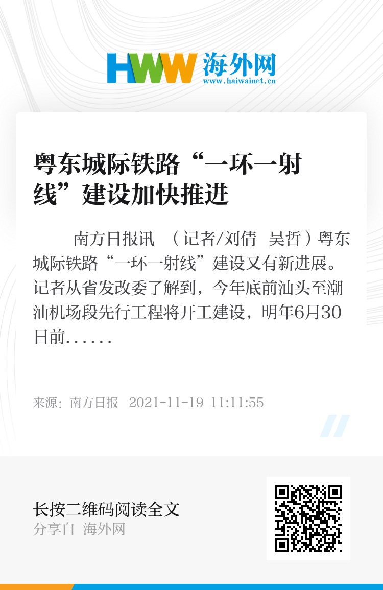 目前,粤东城际“一环一射线”项目揭阳潮汕机场站先行实施工程已于2021年3月开工建设;穿越汕头海湾隧道预埋工程已于2021年9月开工建设。根据接下来的工程建设安排,2021年底前,开工建设汕头至潮汕机场段先行工程:2022年6月30日前,“一环一射线”全线开工建设;2026年12月,全线建成通车。