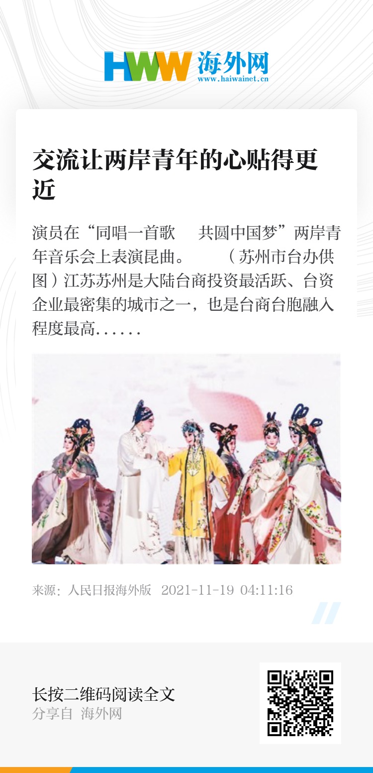 江苏苏州是大陆台商投资最活跃、台资企业最密集的城市之一,也是台商台胞融入程度最高的城市之一。这里有常住台胞近15万人,台资企业1.2万余家,两岸婚姻家庭近4000对,台湾学生6000多名,既是两岸经济合作的高地,也是两岸文化交流的热区。近日,以“赓续一脉 汇融两岸”为主题的2021海峡两岸(苏州)青年文化月在此举办,文化沙龙、文艺表演、文旅体验、文创设计……精彩纷呈的交流活动一直持续至11月底,吸引长三角地区两岸青年代表300余人参加。在交流中,两岸青年共品文化、共叙情谊、共话发展,增进了对彼此的了解,也增强了血脉相连的情感认同,为“两岸一家亲”写下生动注脚。