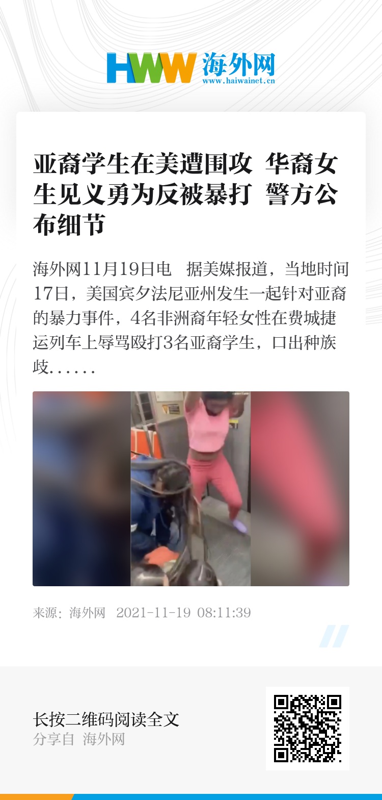 海外网11月19日电 据美媒报道,当地时间17日,美国宾夕法尼亚州发生一起针对亚裔的暴力事件,4名非洲裔年轻女性在费城捷运列车上辱骂殴打3名亚裔学生,口出种族歧视言语,还暴打另一名上前劝阻的华裔女生。费城东南捷运警方18日公布案件细节,并宣布此案属于基于种族主义的犯罪,4名施暴者将面临包括种族恐吓和恶性攻击在内的多项指控。