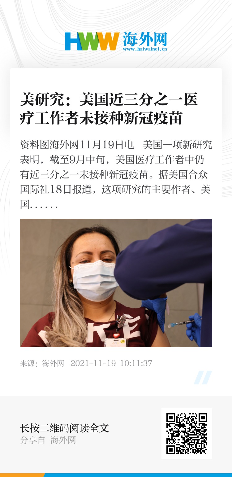 海外网11月19日电 美国一项新研究表明,截至9月中旬,美国医疗工作者中仍有近三分之一未接种新冠疫苗。