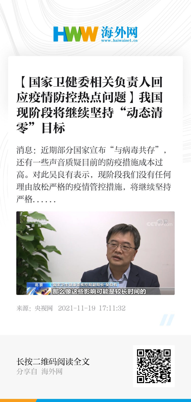国家卫生健康委疾控局副局长 吴良有:我们现在坚持的动态清零目标,并不是说没有感染,而是说发现一起疫情就迅速扑灭一起疫情。我们指挥系统始终处于一个应急的状态,有疫情快速地处置,在最短的时间内把疫情控制住,目前来看,这就是我们用最高的效率、最低的成本、最短的时间来控制疫情的最好的办法。