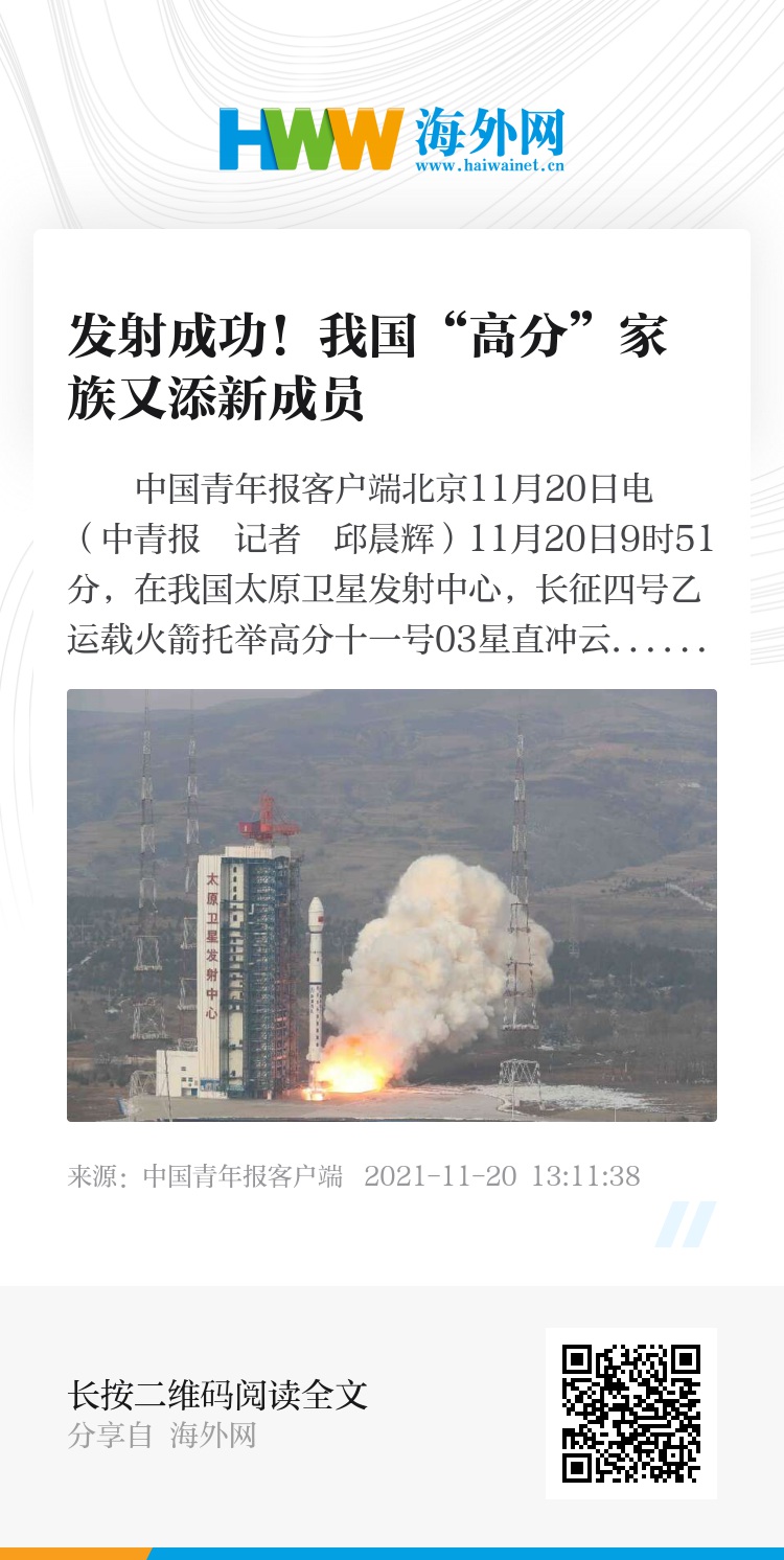 中国青年报客户端北京11月20日电(中青报・中青网记者 邱晨辉)11月20日9时51分,在我国太原卫星发射中心,长征四号乙运载火箭托举高分十一号03星直冲云霄。随后,卫星顺利进入预定轨道,发射任务取得圆满成功。