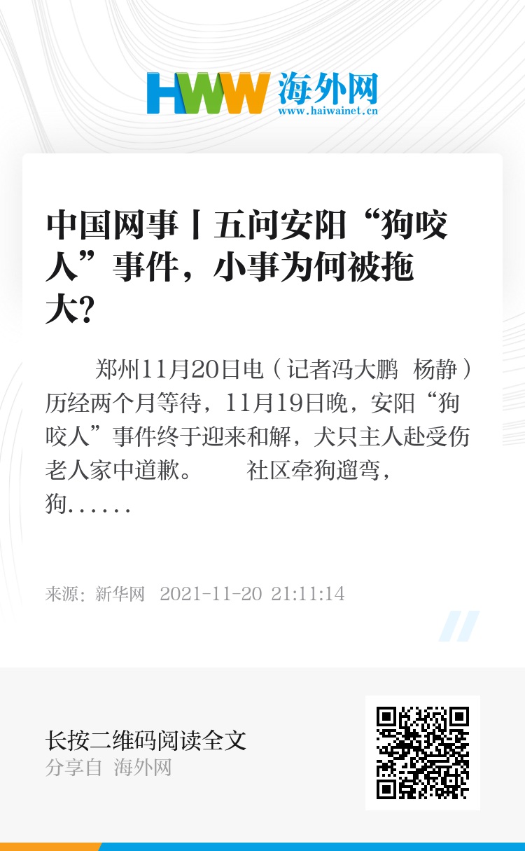 新华社郑州11月20日电(记者冯大鹏 杨静)历经两个月等待,11月19日晚,安阳“狗咬人”事件终于迎来和解,犬只主人赴受伤老人家中道歉。