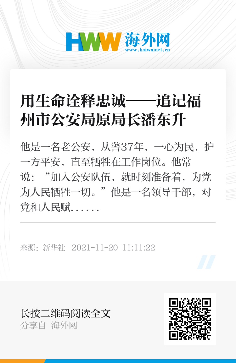9月25日,福建省公安厅党委委员,福州市副市长、市公安局局长,一级巡视员潘东升因长期超负荷工作,突发疾病,牺牲在工作一线。许多民警、群众自发悼念、缅怀他:“潘局用生命践行了‘人民公安为人民’的庄严承诺,为政法干部树立了榜样。”