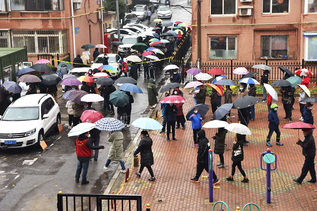 11月21日,辽宁大连,沙河口区马栏街道兰园社区的居民风雨中正在进行第五轮核酸检测。图片来源:人民视觉