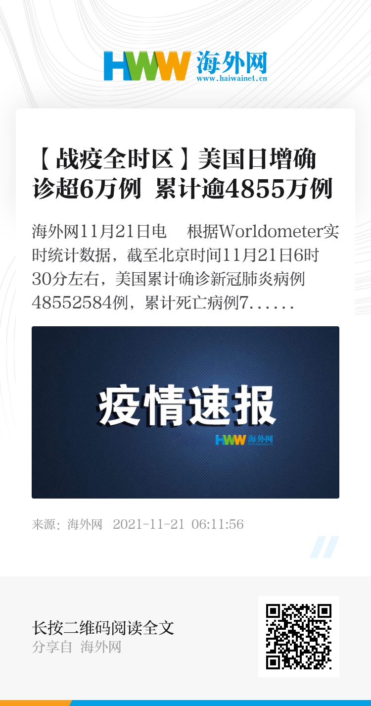 海外网11月21日电 根据Worldometer实时统计数据,截至北京时间11月21日6时30分左右,美国累计确诊新冠肺炎病例48552584例,累计死亡病例793470例。与前一日6时30分数据相比,美国新增确诊病例62278例,新增死亡病例2938例。(海外网 张霓)