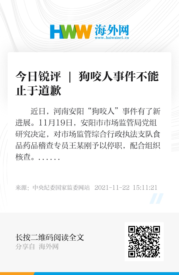 近日,河南安阳“狗咬人”事件有了新进展。11月19日,安阳市市场监管局党组研究决定,对市场监管综合行政执法支队食品药品稽查专员王某刚予以停职,配合组织核查。当天晚上,王某刚前往被狗咬伤的老人家中道歉。