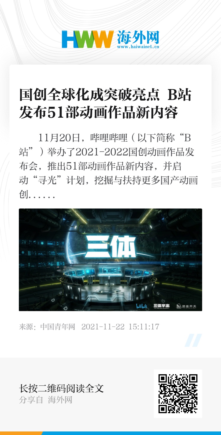 11月20日,哔哩哔哩(以下简称“B站”)举办了2021-2022国创动画作品发布会,推出51部动画作品新内容,并启动“寻光”计划,挖掘与扶持更多国产动画创作者。
