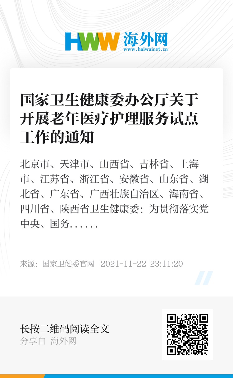 为贯彻落实党中央、国务院关于全面推进健康中国建设,实施积极应对人口老龄化国家战略的重大决策部署,加快推动各地落实《关于促进护理服务业改革与发展的指导意见》《关于加强老年护理服务工作的通知》《关于加强老年人居家医疗服务工作的通知》等要求,切实增加老年人医疗护理服务供给,精准对接老年人多样化医疗护理服务需求。经研究,我委确定部分省份作为老年医疗护理服务试点地区。现将试点工作方案印发给你们,请结合本地实际制定具体试点方案并认真组织实施。