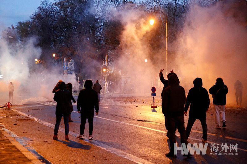 近期比利时新冠疫情再度反弹,为应对疫情,自2021年11月20日起,比利时开始实施一系列疫情防控新措施,包括扩大强制佩戴口罩的范围、强制实行远程办公、推进加强针接种等。11月21日,在比利时首都布鲁塞尔,近3.5万人参加名为“一同为了自由”示威活动,以抗议防疫限制。示威现场,抗议者和警方冲突不断。抗议者向警方投掷烟花弹、石块,警方则出动水泡车驱赶抗议者。(供图:澎湃影像)