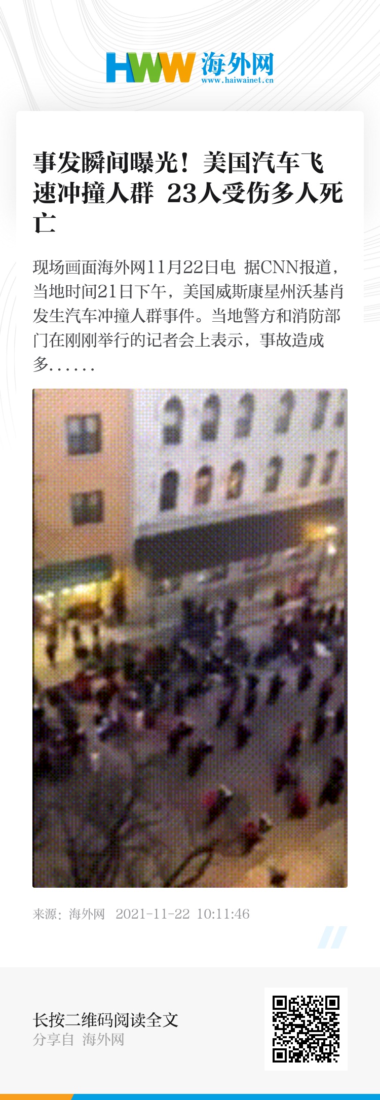 海外网11月22日电 据CNN报道,当地时间21日下午,美国威斯康星州沃基肖发生汽车冲撞人群事件。当地警方和消防部门在刚刚举行的记者会上表示,事故造成多人死亡,另有23名伤者被送院治疗。警方已找到可疑车辆,并逮捕一名嫌疑人。事发时有警察开枪试图逼停车辆,未造成旁观者受伤。