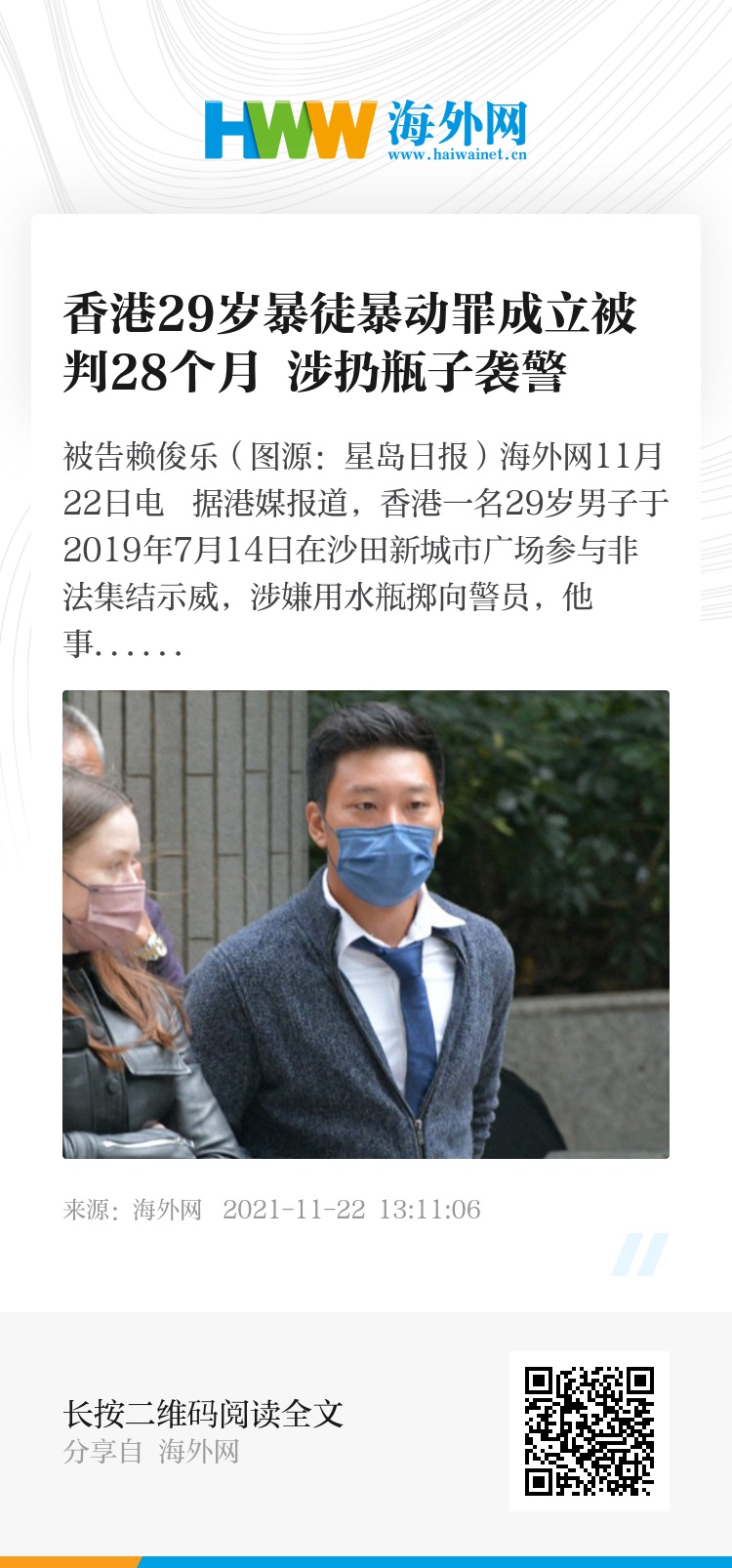海外网11月22日电 据港媒报道,香港一名29岁男子于2019年7月14日在沙田新城市广场参与非法集结示威,涉嫌用水瓶掷向警员,他事后被控一项暴动罪。被告今日(22日)在香港区域法院被裁定暴动罪成,被判入狱28个月。