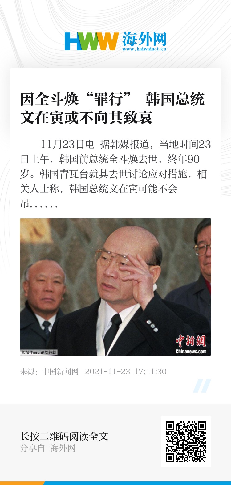 此前报道,全斗焕生于1931年,曾于1980年至1988年间任韩国第11、第12届总统。1996年,全斗焕因涉嫌军事叛乱罪等遭起诉,一审时被判处死刑,后来减刑为无期徒刑。1997年,全斗焕得到特赦,并于1998年初获释。2018年,因涉嫌损害死者名誉案,其又遭起诉。2021年8月,全斗焕被诊断为患有多发性骨髓瘤,11月23日传出其去世消息。