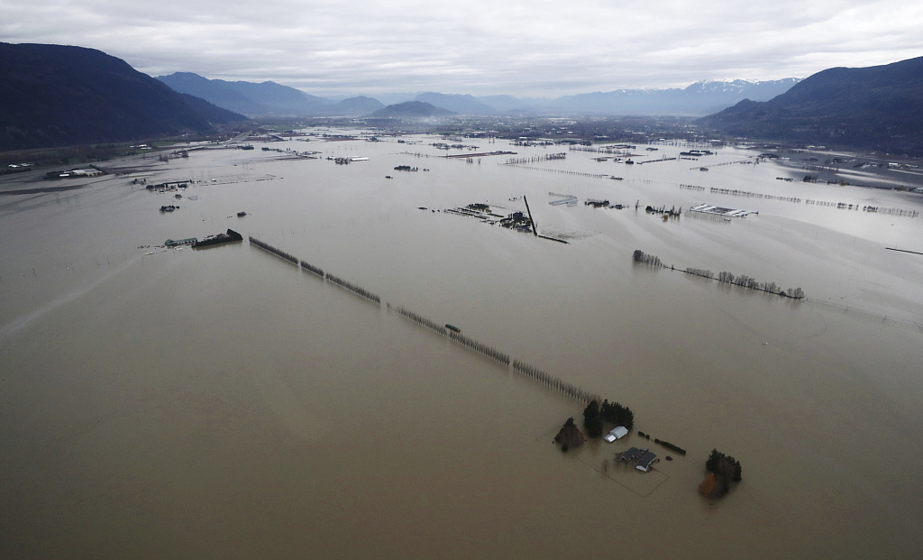 当地时间2021年11月22日,加拿大不列颠哥伦比亚省一个农场被洪水淹没。连日来,加拿大西部省份出现极端天气状况,该国四大省之一的不列颠哥伦比亚省遭遇了被当地官员称作“500年一遇”的特大洪灾,交通陷入瘫痪,必要民生物资匮乏,将近两万人受困。图片来源:视觉中国