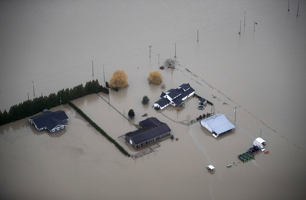 当地时间2021年11月22日,加拿大不列颠哥伦比亚省一个农场被洪水淹没。连日来,加拿大西部省份出现极端天气状况,该国四大省之一的不列颠哥伦比亚省遭遇了被当地官员称作“500年一遇”的特大洪灾,交通陷入瘫痪,必要民生物资匮乏,将近两万人受困。图片来源:视觉中国