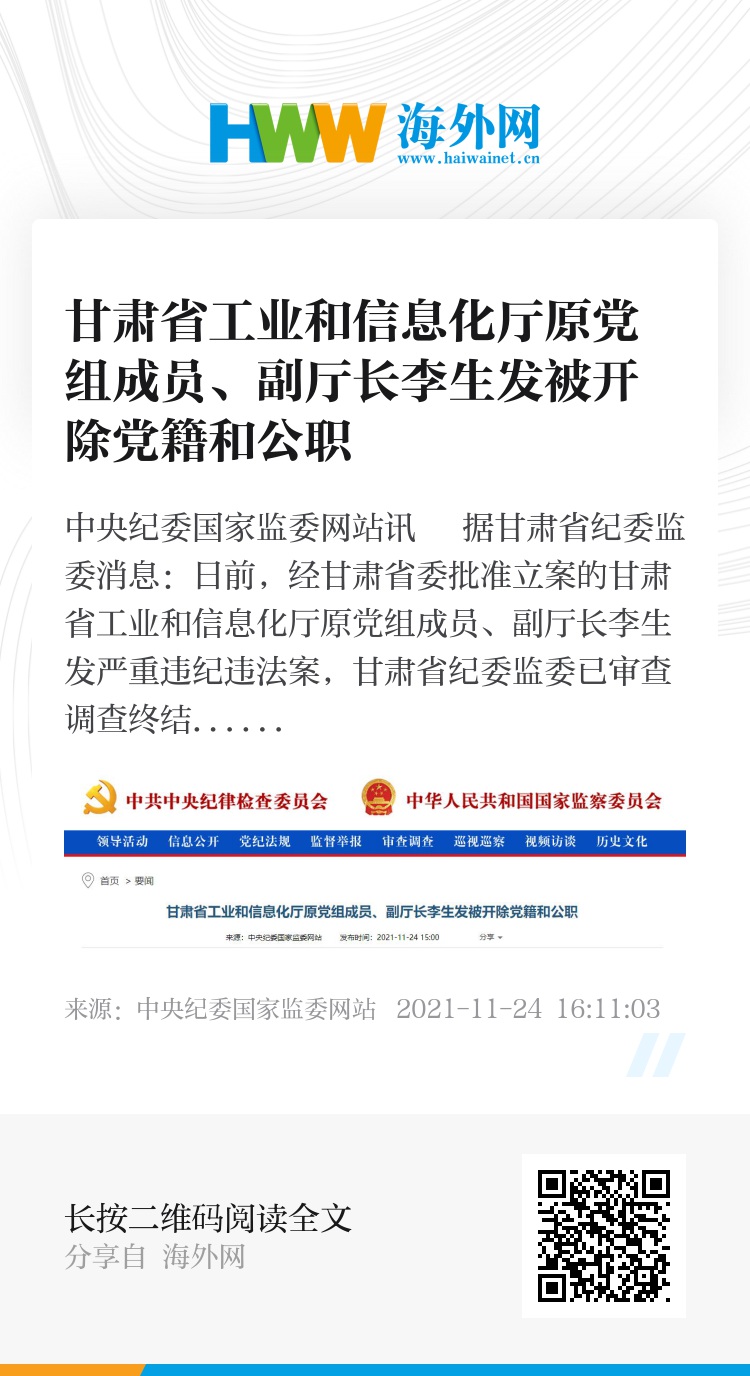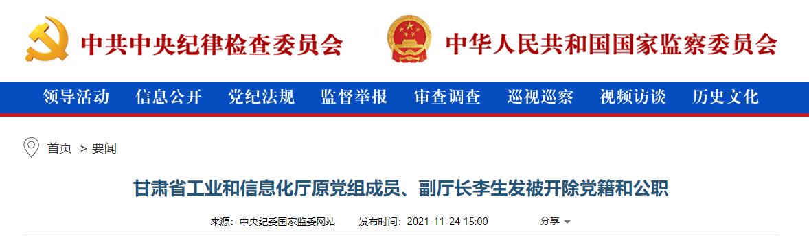中央纪委国家监委网站讯 据甘肃省纪委监委消息:日前,经甘肃省委批准立案的甘肃省工业和信息化厅原党组成员、副厅长李生发严重违纪违法案,甘肃省纪委监委已审查调查终结。
