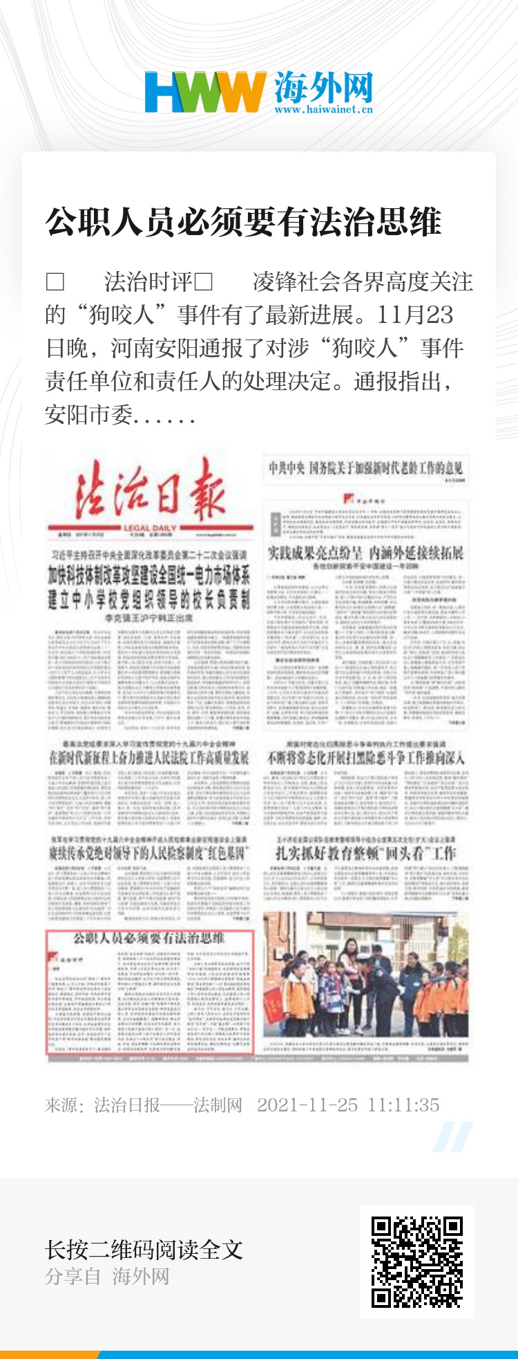 社会各界高度关注的“狗咬人”事件有了最新进展。11月23日晚,河南安阳通报了对涉“狗咬人”事件责任单位和责任人的处理决定。通报指出,安阳市委、市政府责令安阳市城市管理局、市市场监管局、市公安局文峰分局、文峰区中华路街道办事处4个单位作出深刻检查,并在全市通报批评。
