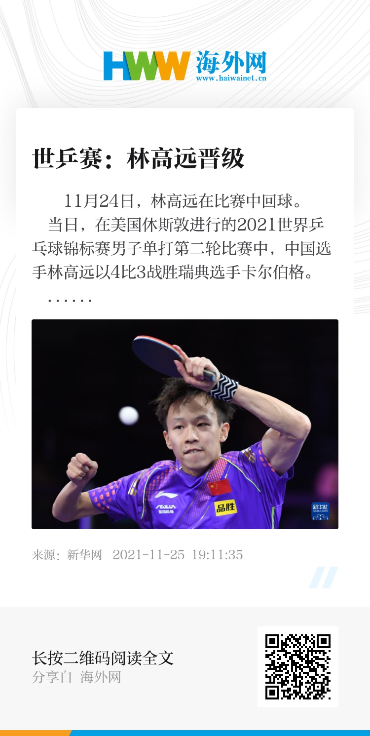 当日,在美国休斯敦进行的2021世界乒乓球锦标赛男子单打第二轮比赛中,中国选手林高远以4比3战胜瑞典选手卡尔伯格。
