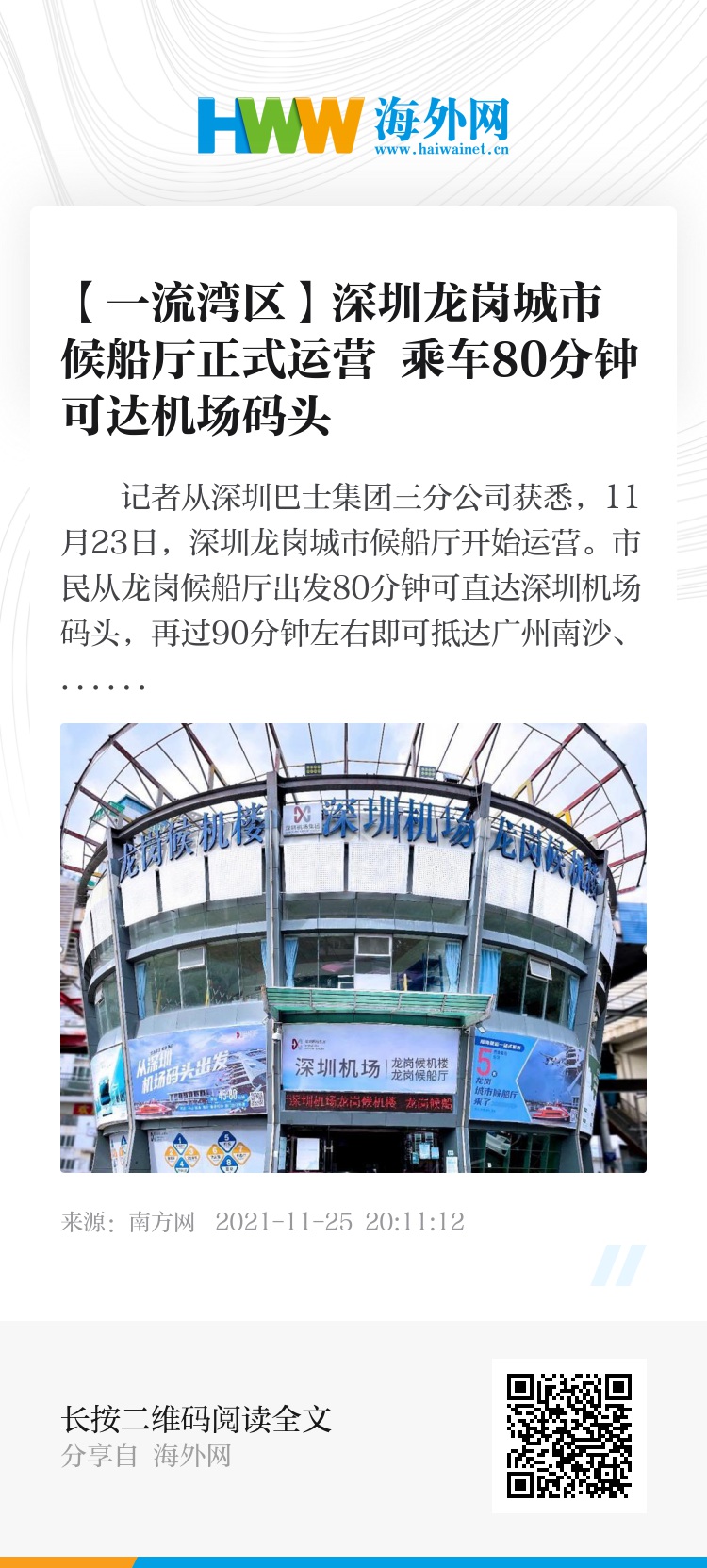据悉,为推动粤港澳大湾区深度融合,打造深圳与珠江口城市和港澳城市的快捷水上通道,2021年深圳机场集团、深圳巴士集团联合创新推出了“城市候船厅”。