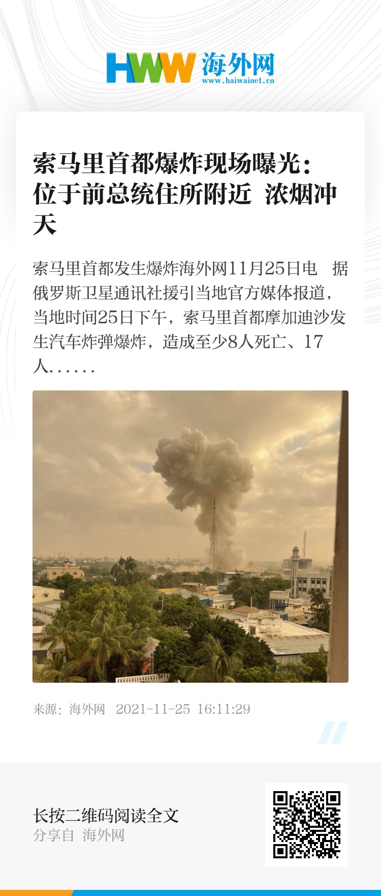 海外网11月25日电 据俄罗斯卫星通讯社援引当地官方媒体报道,当地时间25日下午,索马里首都摩加迪沙发生汽车炸弹爆炸,造成至少8人死亡、17人受伤,爆炸袭击目标是非洲联盟派驻索马里的维和特派团。