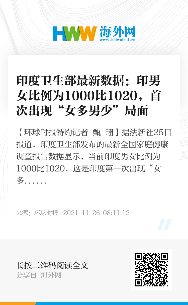 【环球时报特约记者 甄 翔】据法新社25日报道,印度卫生部发布的最新全国家庭健康调查报告数据显示,当前印度男女比例为1000比1020,这是印度第一次出现“女多男少”的局面。