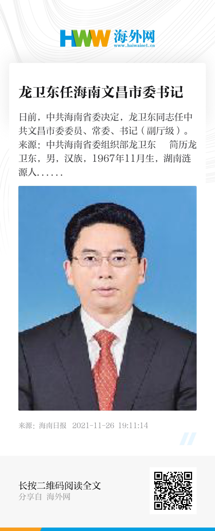 日前,中共海南省委决定,龙卫东同志任中共文昌市委委员、常委、书记(副厅级)。