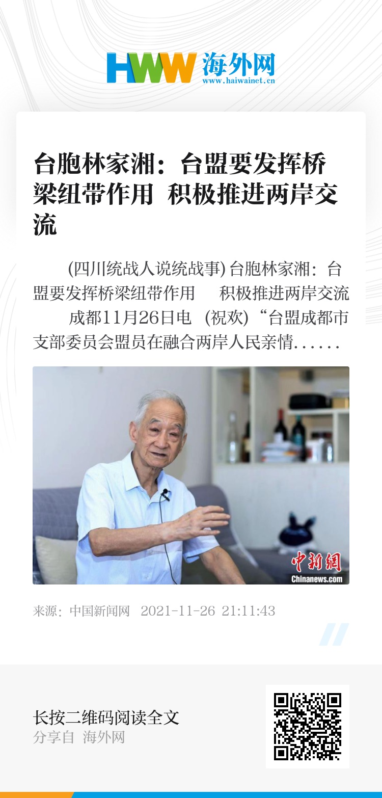 (四川统战人说统战事)台胞林家湘:台盟要发挥桥梁纽带作用 积极推进两岸交流