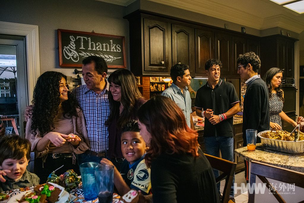 当地时间2021年11月25日,美国德克萨斯州,感恩节当天,家庭成员欢聚一堂。美国传统节日感恩节已经到来,圣诞也渐渐临近,但在通货膨胀的影响下,51%的美国人正在为假期所需的花费发愁。一项新的民意调查显示,美国大多数人都已切身体会到通胀的影响,超过半数(57%)的人认为该国总统拜登需要为此负责。(供图:视觉中国)