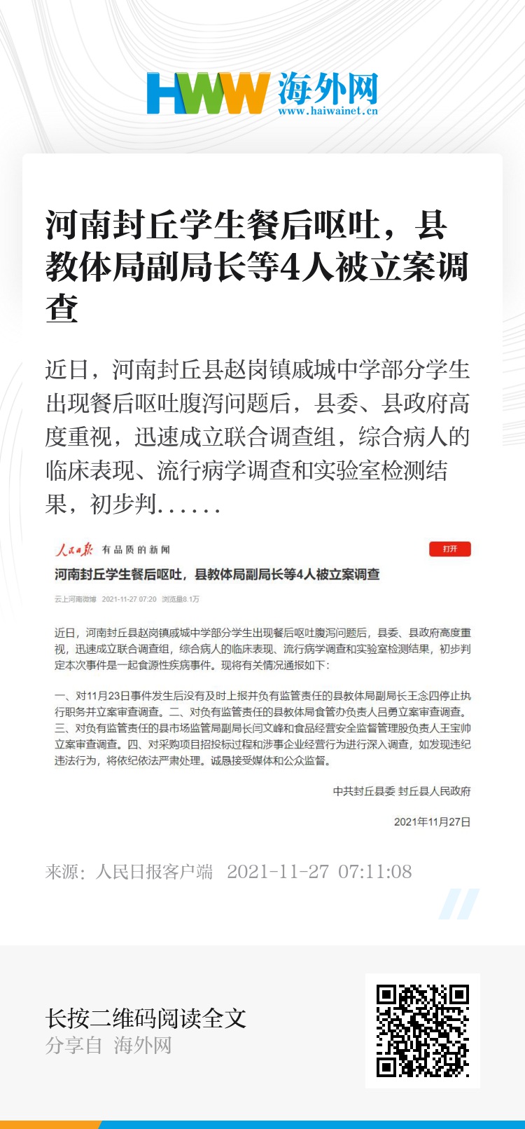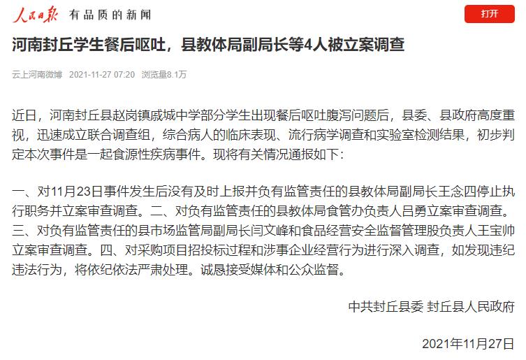 近日,河南封丘县赵岗镇戚城中学部分学生出现餐后呕吐腹泻问题后,县委、县政府高度重视,迅速成立联合调查组,综合病人的临床表现、流行病学调查和实验室检测结果,初步判定本次事件是一起食源性疾病事件。现将有关情况通报如下: